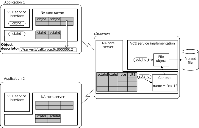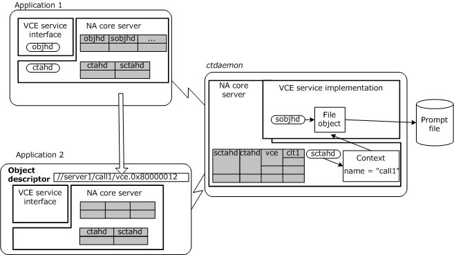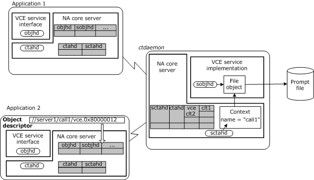 For example, assume that VCE service objects are made sharable. Two applications can then open the same shared prompt file (the service object). Then one application can add messages to the prompt file, while the other application plays the messages that are added.