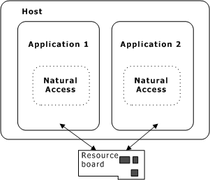 By using the in-process approach shown in the following illustration, each application maintains an independent Natural Access programming environment. An application uses the Natural Access functionality to create, manage, and destroy resources. This approach provides the most efficient processing.