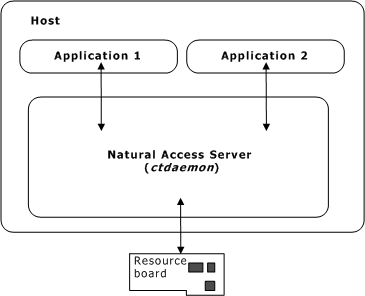 In the configuration shown in the following illustration, multiple applications share a common resource locally. The applications and Natural Access Server (ctdaemon) are running in the same host. For example, in an IVR system, one application can establish connections to and from the PSTN, while another plays voice files over this connection.