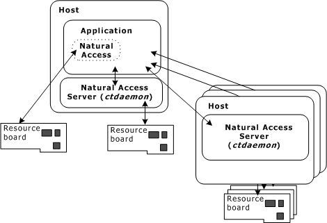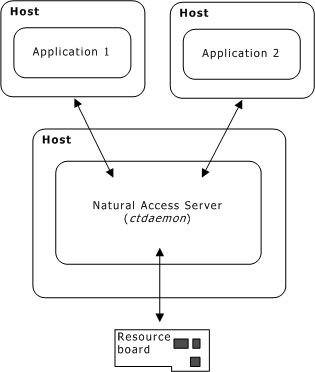 In the configuration shown in the following illustration, applications share resources through a remote Natural Access Server (ctdaemon). The applications and Natural Access Server (ctdaemon) are running in separate hosts. This approach is an efficient method of performing multiple tasks utilizing a remote Natural Access Server (ctdaemon) over a network connection.