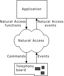 Natural Access is a development environment that provides standard programming interfaces for hardware-independent telephony functions. The following illustration shows the relationship of Natural Access to an application and to a telephony board: