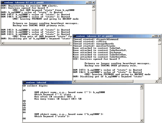 Open the first window and enter the following command at the prompt: takecmd This command brings up the application that controls the behavior of takeover. | ||||||||||