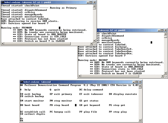 To run the takeover demonstration program, open three windows: one for the primary instance of takeover, one for the backup instance of takeover, and one for the takecmd control program.