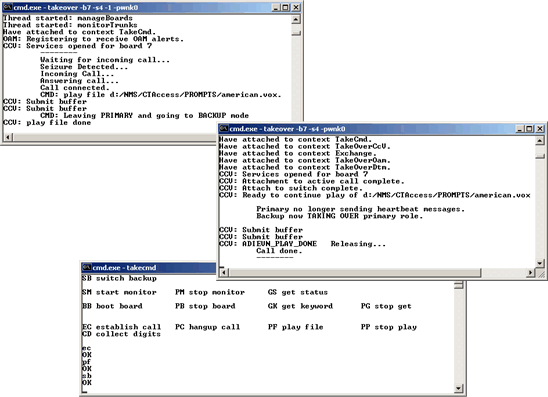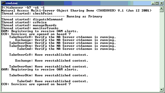 This program consists of two applications, takeover and takecmd. takeover is the main demonstration program that opens Natural Access services and exchanges checkpoint information with another running instance of takeover. Each instance of takeover is started independently.