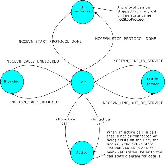 The following table lists the line states. One or more transitional events associated with each state indicate transition into the state. An application can use nccGetLineStatus to determine the state of a line: