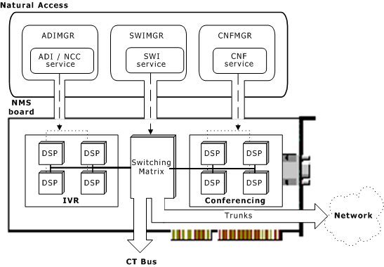 On NMS Communications AG and CG boards, NaturalConference functions communicate with enhanced voice processing modules running on digital signal processors (DSPs):