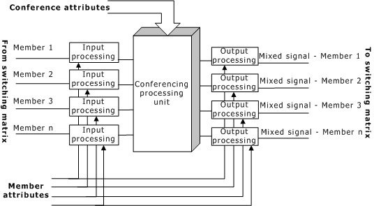 NaturalConference performs processing for each member's voice input individually, mixes according to the conference attributes, and generates the output signal for each member. The following illustration summarizes the processing chain performed by the conferencing code: