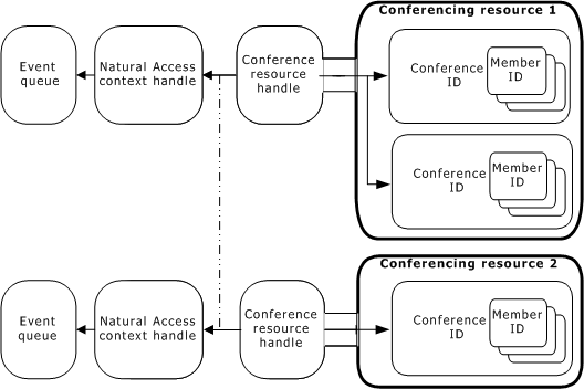 Any call to NaturalConference requires a conference resource handle (cnfresourcehd). A conference resource handle links a context and a conference resource. An application can create as many of these paths as necessary among contexts. To obtain a conference resource handle, open a conference resource with cnfOpenResource. Once you have a cnfresourcehd, you can create conferences and add members to them.