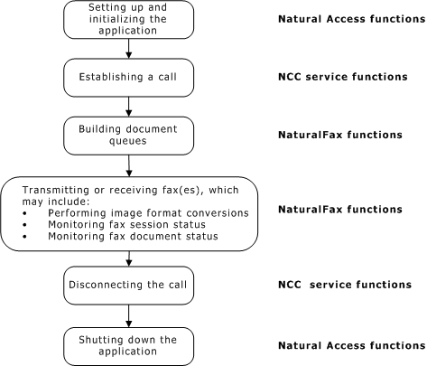 A NaturalFax application uses Natural Access functions to control the PSTN and NaturalFax functions to manage fax sessions and related tasks. The Natural Call Control service is responsible for establishing and disconnecting the calls.