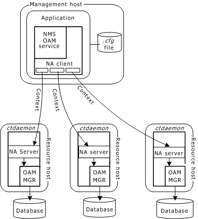 Applications on the management host can use NMS OAM on a resource host to configure, start, and manage its resources based on the NMS OAM database on that host.