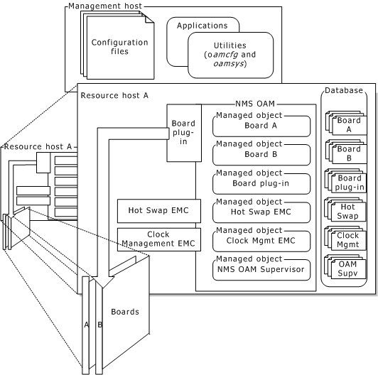 Each resource host runs an instance of the Natural Access Server (ctdaemon), including NMS OAM. Each resource host has its own set of managed objects for its components, including boards, plug-ins, and EMCs. Each resource host also has its own NMS OAM database containing data for the components on that host only.