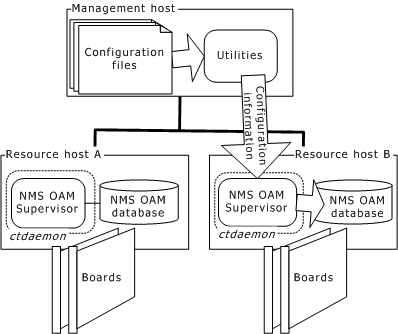 Configuration of remote resources is performed from the management host using NMS utilities or other applications based upon the NMS OAM service, as shown in the following illustration: