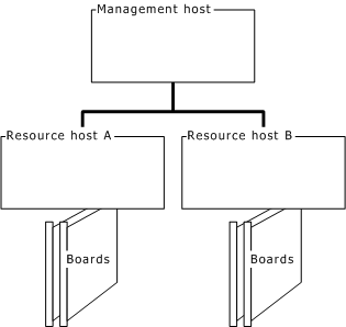 A multiple-host NMS OAM configuration consists of several hosts (CPUs). The management host configures and manages the resources (such as boards) on the other hosts. These hosts are called resource hosts as shown in the following illustration: