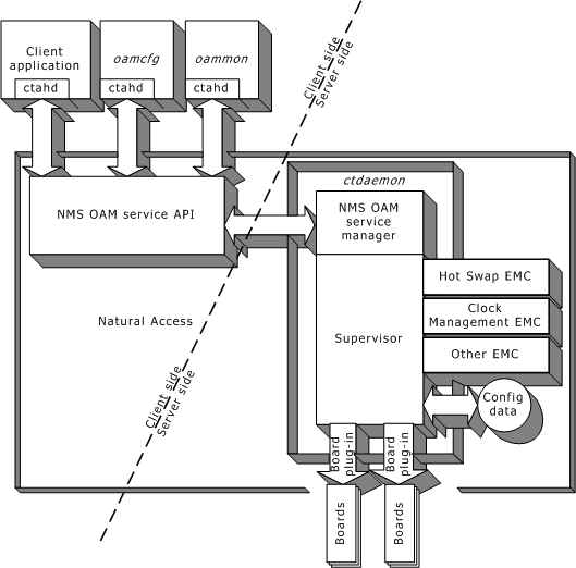 The client side and server side can reside in the same system, or in different systems linked by an IP network. The client side contains one or more client applications that communicate with NMS OAM through its API, using one or more contexts. An NMS OAM service instance is started on each context. Each instance communicates with the NMS OAM service manager component of the Natural Access Server (ctdaemon) on the server side.