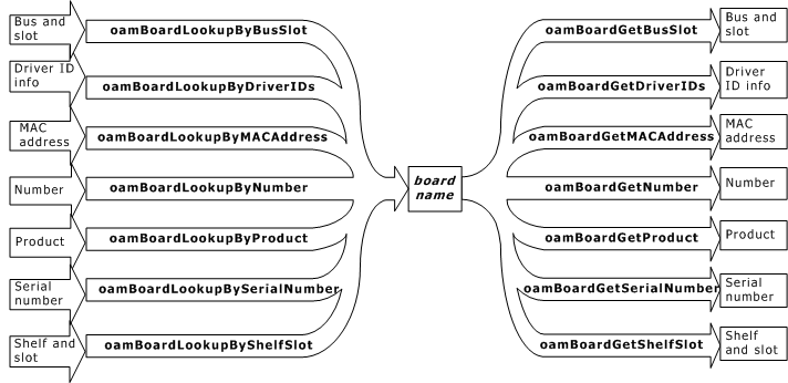 The primary way to identify each board to NMS OAM is by its board name. As shown in the following illustration, the NMS OAM service provides several functions to retrieve information about a board, given a board name. If the name is not known, other functions are provided to retrieve the name of a board based on other information about the board.