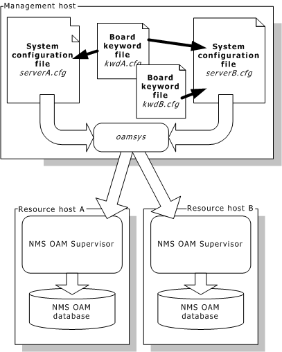 If you have a multiple-host NMS OAM configuration, create a separate system configuration file for each resource host, containing configuration information for that host only. Store all system configuration files and board keyword files on the host system. To configure and start up resource hosts, run oamsys multiple times, each time specifying a different resource host and system configuration file. The system configuration files can share keyword files, if necessary. The following illustration shows using oamsys in a multiple-host configuration: