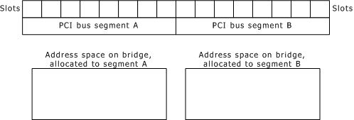 Each device requires a certain amount of address space on the bridges. At boot time, the system BIOS configures address space windows on each bridge to define the range of addresses (that is, the bus number or memory address) that are allocated behind that bridge. The following illustration shows segments and allocated address space on bridge: