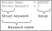 Struct keywords are similar to C language structures. A struct is a group of related named values (elements) under a common name. The fully qualified keyword name for each element in the struct consists of the struct name, followed by a period (.) and then the element name. Within NMS OAM, the fully qualified keyword name for an element is always used to refer to the element. The following illustration shows Struct keyword names: