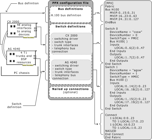 The following illustration provides an overview of the PPX configuration file and its structure. The example system contains two boards. The PPX configuration file has a bus definition section describing the bus connecting the boards. Each board also has a switch configuration section.