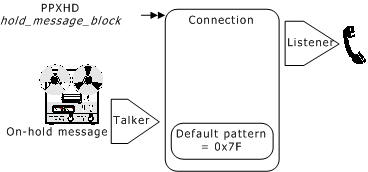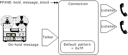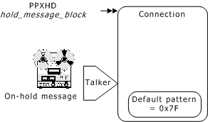 In the following illustration, the talker is added to the hold_message_block. The talker is a DSP resource playing the on-hold message.