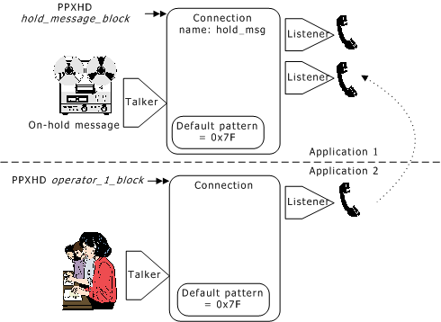 In the previous illustration, the hold_message_block was created with the name hold_msg. In the system, one application is managing incoming calls and transferring them to operators when they are available. Another application is used to manage the operator stations. If an operator needs to place the caller back on-hold, the application can open the connection named hold_msg. The connection handle hold_message_block is returned and the application can then add the caller as a listener to that connection.