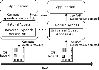 After initializing the Universal Speech Access API, applications use USAI functions to request text-to-speech (TTS) synthesizer resources from a speech server. Each synthesizer resource is associated with a specific NaturalAccess context.