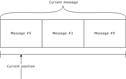 When you play a message or a list of messages, the message or message list becomes the current message for pausing, resuming, and repositioning. The current message is associated with the context handle. The current message has a current position, as illustrated: