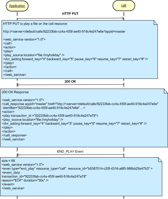 The following diagram illustrates the play action process on a call resource. This scenario assumes a call resource has already been created and the application has an eventhandler resource to monitor the play events.