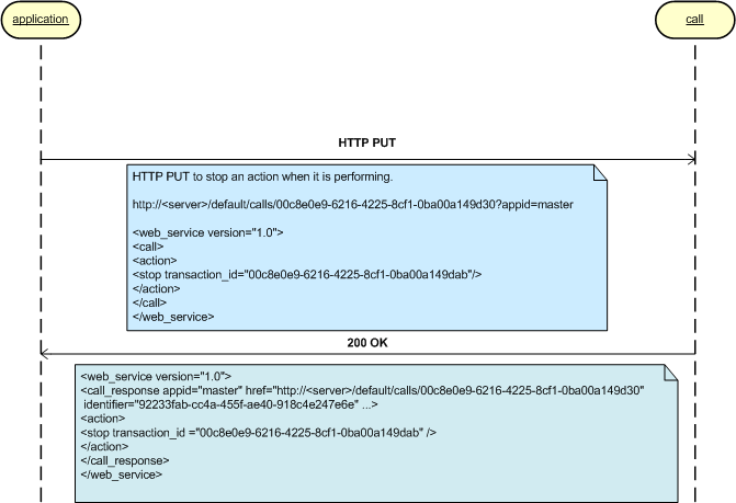 The following diagram illustrates the stop action. A stop action only applies to actions that return a transaction ID in HTTP response payload. These actions include <play>, <playrecord>, <playcollect>, and <overlay>.