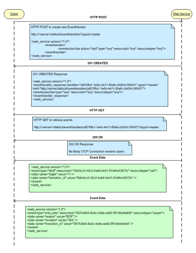 For PowerMedia XMS, HTTP event streaming is implemented in the eventhandler resource. When the client wishes to receive asynchronous events, it uses an HTTP POST to create an eventhandler and subscribe to specific event types. The client then performs an HTTP GET on the newly created eventhandler and the PowerMedia XMS RESTful API responds with a 200 OK; however, the TCP connection remains open. Any event data related to resources and event types are pushed to the client until the Eventhandler is deleted by the client.