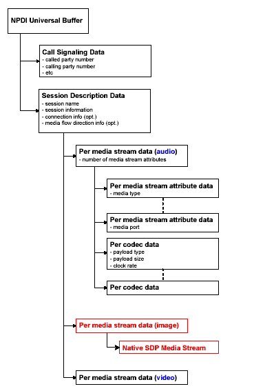 The nested NPDI structure treats a media stream regardless of its type (for example, audio, video, image, whiteboard, application, data) therefore the DSP Native Media Stream TLV is contained inside the NPDI Per-Media Stream TLV (0x2A01).