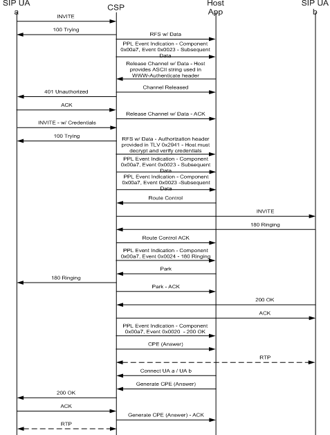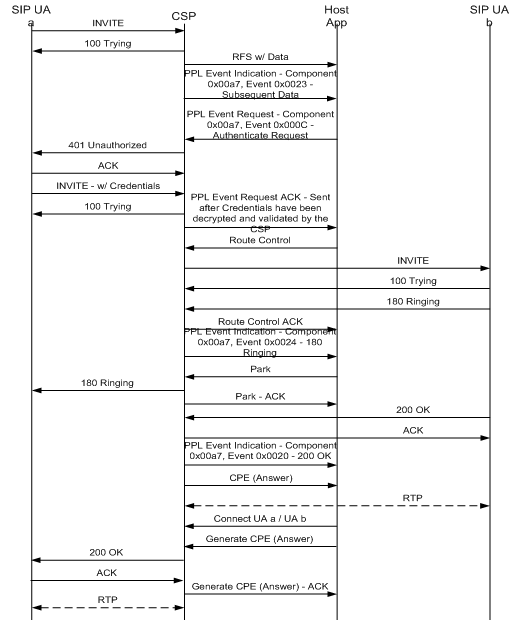 When the CSP receives the PPL Event Request message, the SIP stack will send the 401 Unauthorized response and include the WWW-Authenticate header using the information from the above TLVs. When the INVITE with credentials arrives, the CSP decrypts and validates the credentials and send the PPL Event Request ACK to the host.