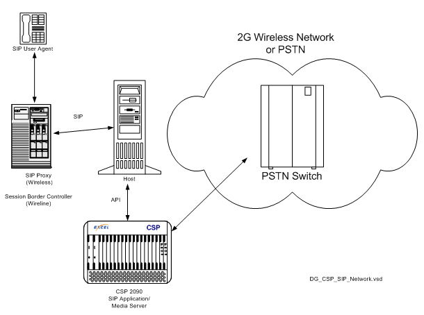 The following diagram shows a SIP based network architecture with the high-level functionality provided by the CSP. The network can be 3G Wireless or Wireline.