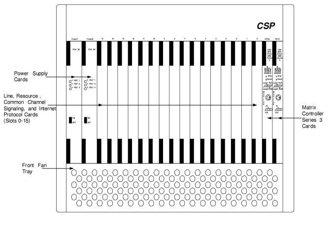 A typical CSP 2110 chassis can accommodate up to 2,048 ports, support matrix CPU cards, a fully configurable combination of line and services cards, and a host interface. The CSP supports redundancy and the cards are hot swappable. Blockout cards are required for proper air flow and cooling. Any unoccupied line card slot or I/O card slot should have a Blockout card installed.
