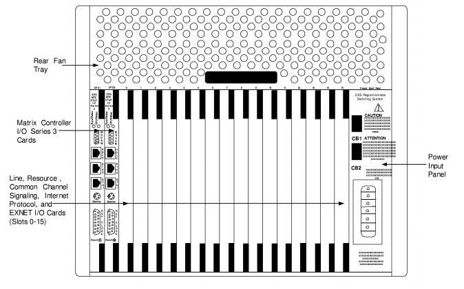 The rear of the chassis has dedicated slots for the Matrix Controller I/O cards. Slots 0-15 are for the other I/O cards. The power input panel is also located at the rear of the chassis