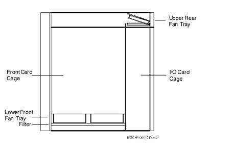 This shows the approximate location of the fan trays and the front and rear card cages.
