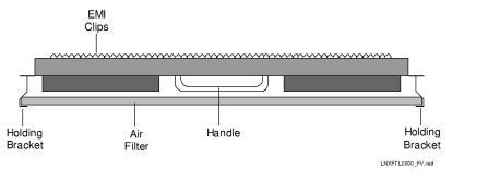 The front fan tray and rear fan tray, as shown below, are both required to ensure proper air flow and cooling of the CSP 2110 chassis. The front fan tray is powered by the -48 V DC midplane bus. It can be removed with the power on. The front fan tray provides an air filter to remove particulate accumulation.