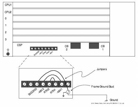 You connect the external power source to the chassis at the terminal block (Terminal Block Factory-Installed Wiring ) on the Power Input Panel. The factory-installed wiring configuration enables you to connect a single power source to the chassis without adjusting the jumpers.