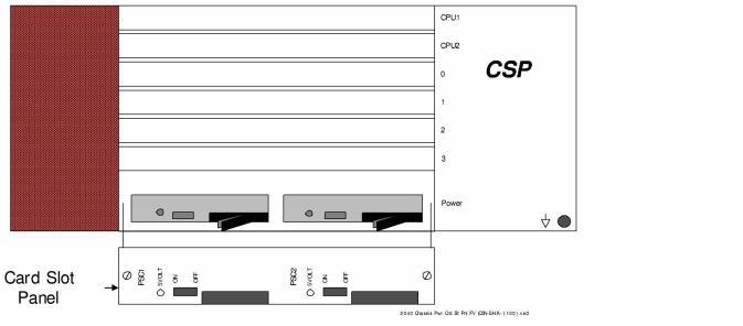 The two Power Supply card slots, PSC1 and PCS2, are covered by a card slot panel (Panel for the PSC1 and PSC2 Card Slots ) that attaches to the front of the chassis. This panel is not attached to the installed Power Supply cards. It covers their front panels but provides access to their LEDs and power switches.