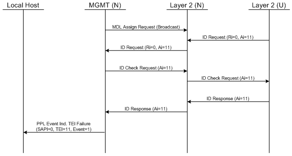 The procedure below shows a check procedure being initiated when a TEI is already assigned. The ID Check Response message returns the same TEI, and the TEI failure is propagated to the host.
