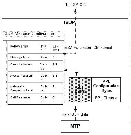 As shown in the figure below, the raw ISUP data from MTP is compared against the template to identify the ISUP message type and convert the raw data into the format of an SS7 Parameters ICB to send to L3P.