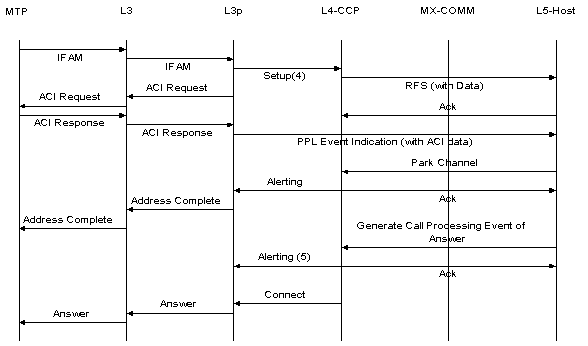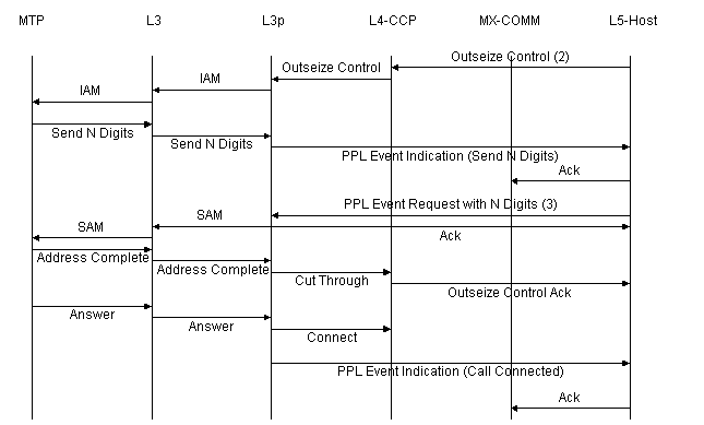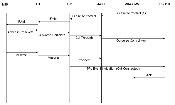 The following is a call flow diagram in which a successful call is originated from the host. All address digits are present in the Outseize Control message, therefore an IFAM is issued to the lower layers.