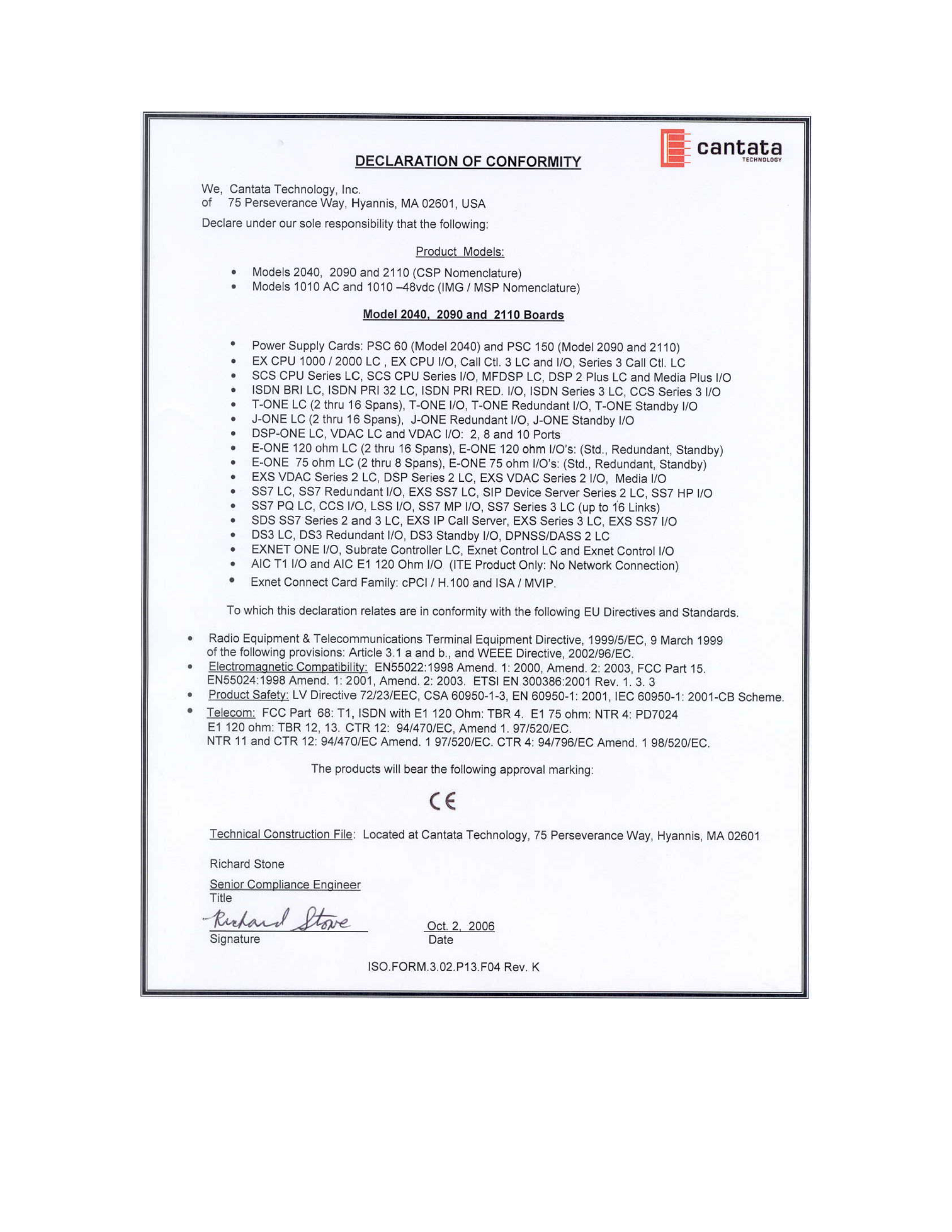 In this section, you can find the European Declarations of Conformity. Refer to the Cantata salesperson for the latest copies.