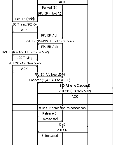 The call flow below shows a scenario where the initial conversation between two SIP endpoints (A/B) is put on hold and a third party (C) is connected to the calling party of the initial conversation (A).