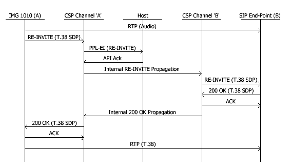 5. The SIP endpoint B accepts the inbound T.38 SDP offer and responds with an outbound T.38 SDP answer. The 200 OK internally propagates through the signaling and call processing layers in the CSP and is delivered to IMG 1010 ‘A’.