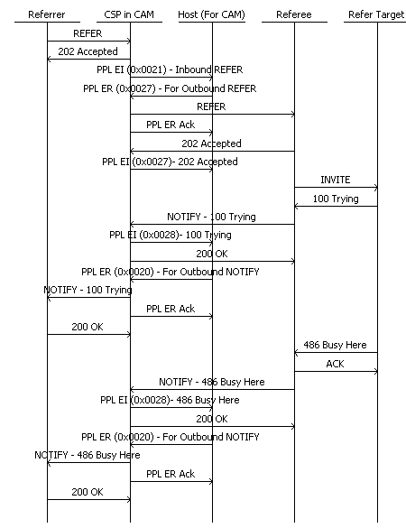 Whenever there is an incoming REFER request, the REFER-TO header is reported to the host in the PPL Event Indication (Event 0x0021; Component 0x00A7). The host can propagate the REFER request to the outbound leg using the PPL Event Request message (Event 0x0027; Component 0x00A7).