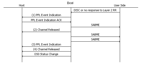 3. If the D channel is re-established within the period of the T309 timer (90 s), all active calls are maintained and the host is sent a PPL Event Indication message of Network Side D Channel