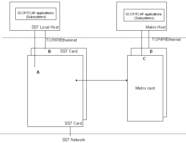 In the next diagram, A, B, C, and D are the host link failure detection points where the host link failure detection logic resides. Host link failure detection is set up as two separate processes: one for an SS7 card and one for a Matrix Controller card.