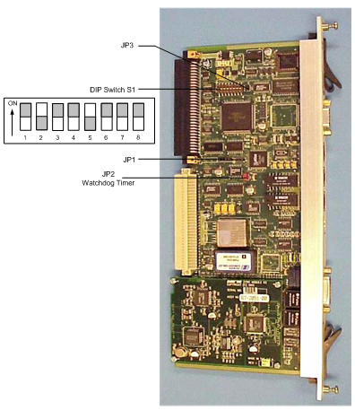 DIP switch (S1) is used to enable and disable the debug function and baud rates for the MONITOR (debug) port. It is also used to select the input reference clock speed.
