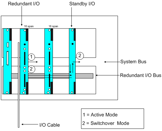 Voice and data on the E-ONE 120 Ohm Redundant I/O card are switched to the Redundant I/O bus and routed to the E-ONE 120 Ohm Standby I/O card where they are switched to the system bus and routed to the Standby line card. |